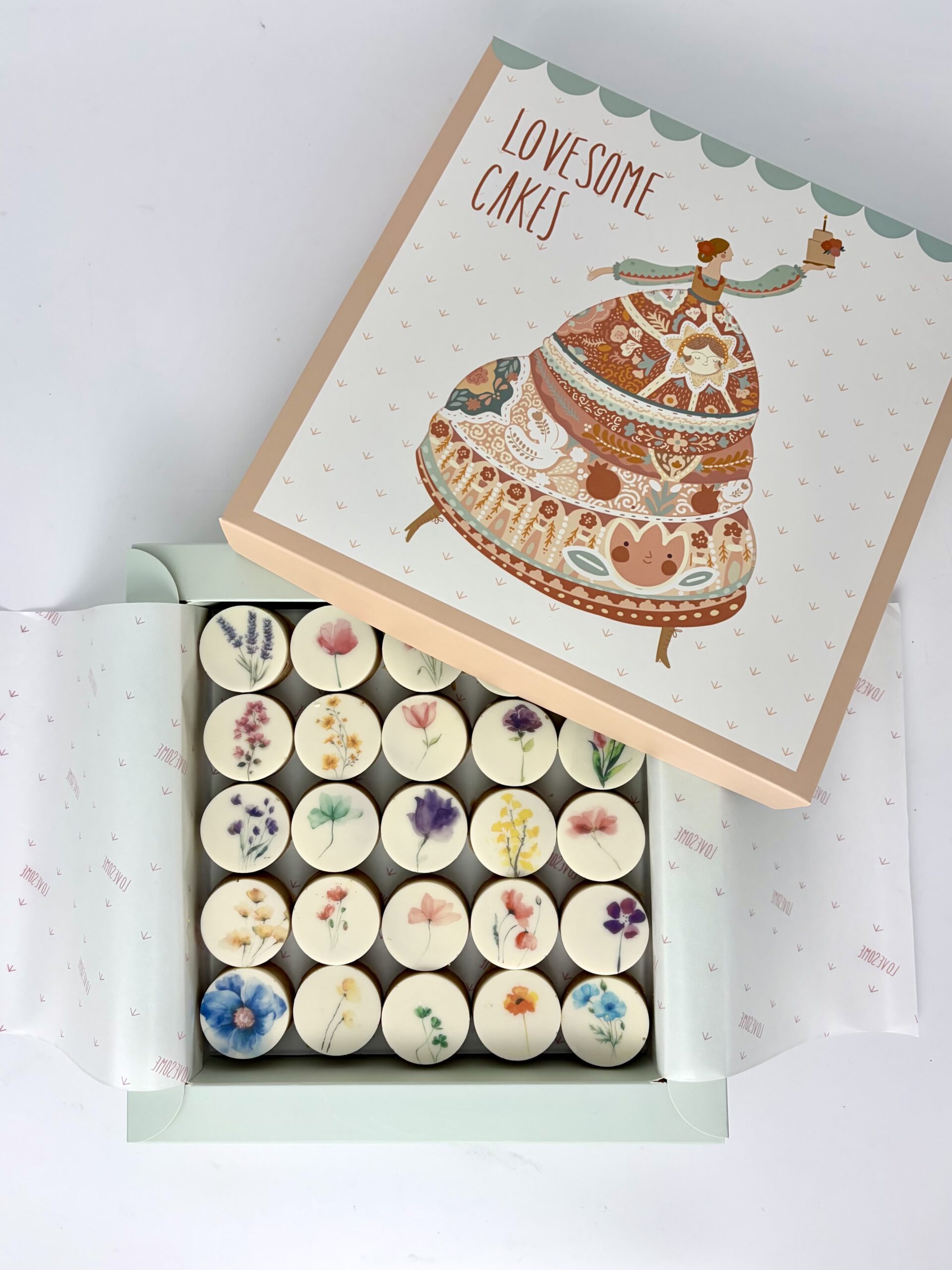 Traditional chickpea cookies made with chickpea flour, completely gluten-free, coated in white chocolate and finished with delicate floral designs.